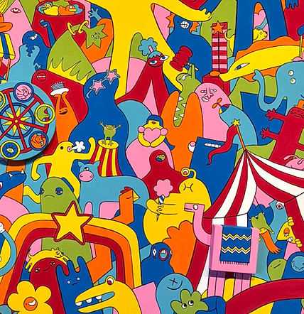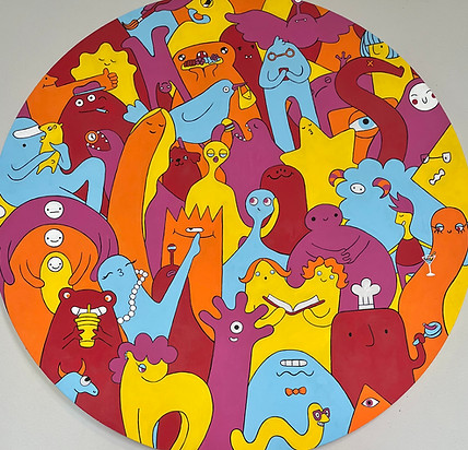Kaleidoscape (2025) is a collection of mixed media works — primarily acrylic and ceramic paintings — that explore the relationship between identity and belonging within community. Each piece features playful, colorful figures within larger crowds, reflecting the tension between the desire to stand out and the longing to belong. The work captures the journey of self-discovery: the need to express individuality, and the simultaneous yearning for connection and tribe.